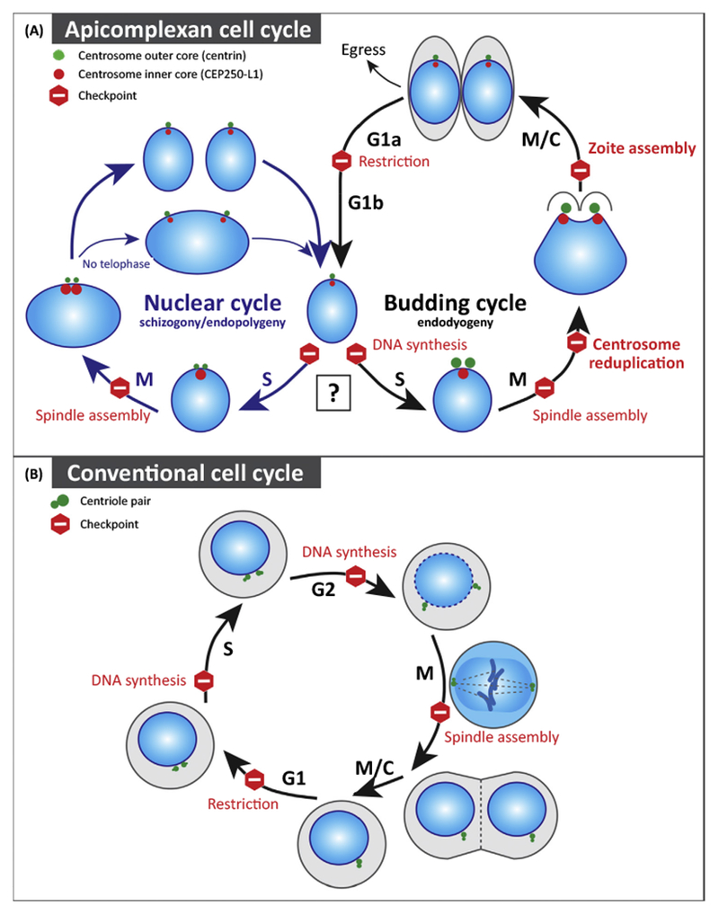 Suvorova ES, Francia M, Striepen B, White MW. (2015). A novel bipartite centrosome coordinates the apicomplexan cell cycle. PLoS Biol.