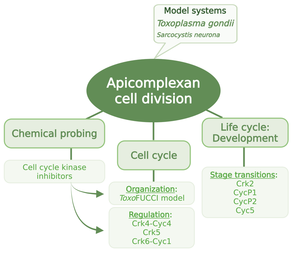 Meanwhile, an inner core closely aligned with the spindle pole compartment, the centrocone, holds distant orthologs of the CEP250 / C-Nap protein family and replicates in early mitosis. We showed that concurrent mitosis and cytokinesis can disconnect by breaking a physical link between centrosome cores. The bipartite centrosome mechanism, therefore, can explain the co- existence of nuclear and budding cycles and may yield a therapeutic target. Discovery of the bipartite centrosome and the modular cell cycle led us to question whether the cell cycle of apicomplexa parasites is under alternative regulation. To find out if differences are hidden among the central cell cycle regulators, we evaluated apicomplexan genomes and found the absence of traditional cell cycle Cdks and cyclins (proteins essential for progressing mitosis in eukaryotes).